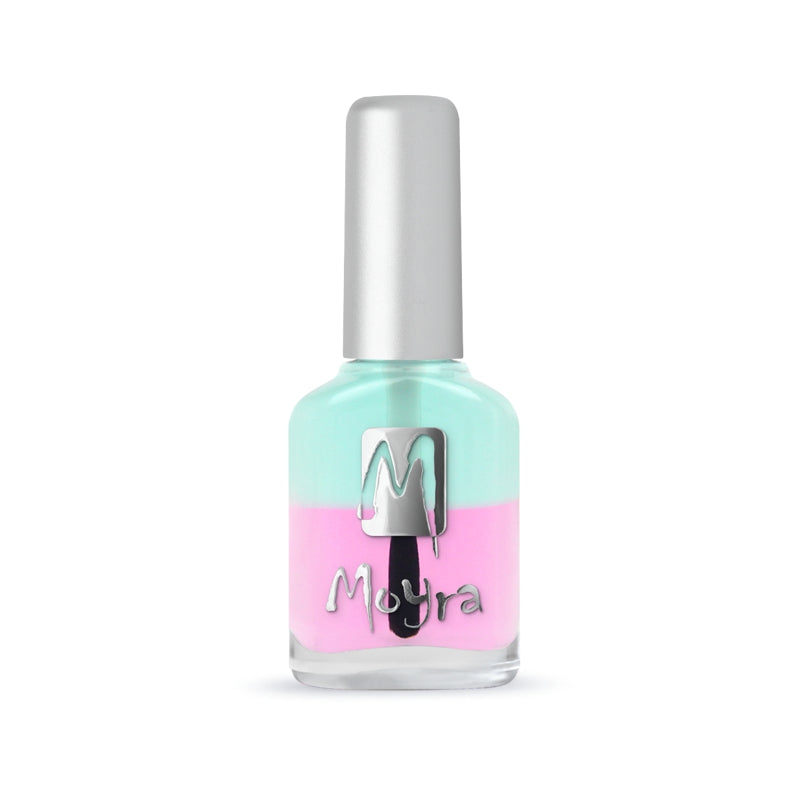 Óleo bifásico Moyra para cuidados com a pele e unhas, com aroma frutado. Ao agitar o produto, os componentes nutritivos e hidratantes dos óleos são misturados e ativados.